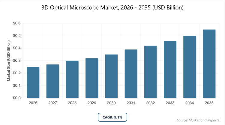 According to MarketnReports, the global 3D Optical Microscope market size was estimated at USD 0.25 billion in 2025 and is expected to reach USD 0.6 billion by 2035, growing at a CAGR of 9.1% from 2026 to 2035. The 3D Optical Microscope Market is driven by the rising demand for high-resolution imaging in semiconductor inspection and life sciences research.