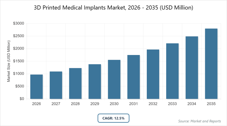 According to MarketnReports, the global 3D Printed Medical Implants market size was estimated at USD 969.5 million in 2025 and is expected to reach USD 3,148.2 million by 2035, growing at a CAGR of 12.5% from 2026 to 2035. The 3D Printed Medical Implants Market is driven by increasing demand for personalized implants and advancements in additive manufacturing technologies.