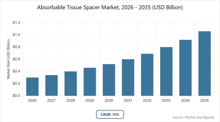 According to MarketnReports, the global Absorbable Tissue Spacer market size was estimated at USD 0.3 billion in 2025 and is expected to reach USD 1.2 billion by 2035, growing at a CAGR of 15% from 2026 to 2035. The Absorbable Tissue Spacer Market is driven by the increasing prevalence of cancer and advancements in radiation therapy techniques.