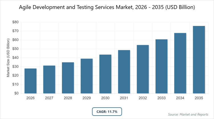 According to MarketnReports, the global Agile Development and Testing Services Market size was estimated at USD 28 Billion in 2025 and is expected to reach USD 85 Billion by 2035, growing at a CAGR of 11.7% from 2026 to 2035. Agile Development and Testing Services Market is driven by increasing adoption of agile methodologies for faster software delivery and enhanced collaboration.