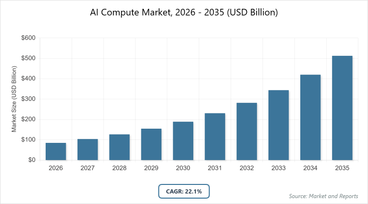 According to MarketnReports, the global AI Compute market size was estimated at USD 85 billion in 2025 and is expected to reach USD 620 billion by 2035, growing at a CAGR of 22.1% from 2026 to 2035. AI Compute Market is driven by explosive growth in large language models, generative AI, and the race for exascale AI training infrastructure.