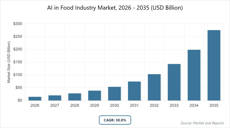 According to MarketnReports, the global AI in Food Industry market size was estimated at USD 14.41 billion in 2025 and is expected to reach USD 382.44 billion by 2035, growing at a CAGR of 38.8% from 2026 to 2035. AI in Food Industry Market is driven by the increasing demand for enhanced operational efficiency, food safety compliance, and personalized consumer experiences.