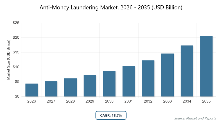 According to MarketnReports, the global Anti-Money Laundering market size was estimated at USD 4.4 billion in 2025 and is expected to reach USD 23.8 billion by 2035, growing at a CAGR of 18.7% from 2026 to 2035. Increasing regulatory enforcement and rising financial fraud activities.
