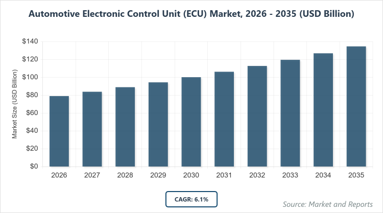 According to MarketnReports, the global Automotive Electronic Control Unit (ECU) market size was estimated at USD 79 billion in 2025 and is expected to reach USD 142 billion by 2035, growing at a CAGR of 6.1% from 2026 to 2035. Automotive Electronic Control Unit (ECU) Market is driven by surging vehicle electrification, rising adoption of advanced driver-assistance systems (ADAS), and stricter global emission and safety regulations.