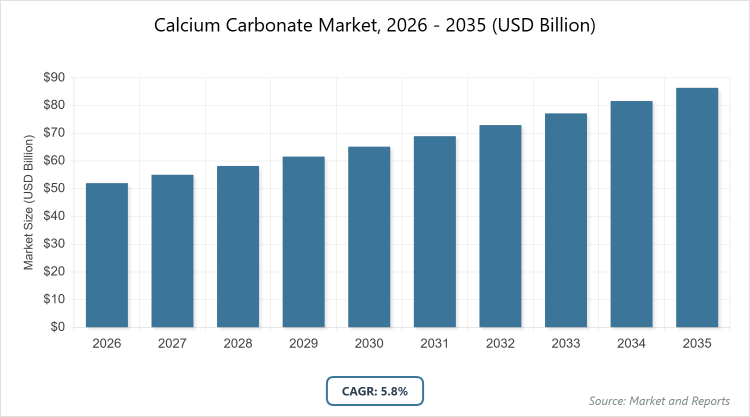 - The global calcium carbonate market is projected to grow from approximately USD 52 billion in 2026 to USD 92 billion by 2035, reflecting robust demand across diverse applications.