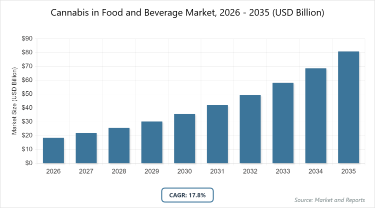 The Cannabis in Food and Beverage market is expected to register a CAGR of 17.8% during the forecast period from 2026 to 2035.
