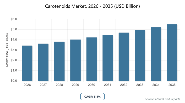 According to MarketnReports, the global Carotenoids Market size was estimated at USD 3.43 Billion in 2025 and is expected to reach USD 5.81 Billion by 2035, growing at a CAGR of 5.4% from 2026 to 2035. Carotenoids Market is driven by increasing consumer demand for natural antioxidants and clean-label products in food and supplements.