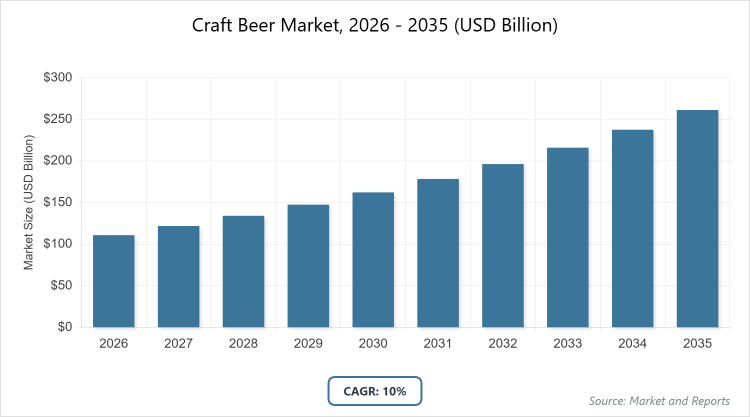 According to MarketnReports, the global Craft Beer market size was estimated at USD 110.8 billion in 2025 and is expected to reach USD 285.3 billion by 2035, growing at a CAGR of 10% from 2026 to 2035. Craft Beer Market is driven by increasing demand for unique flavors and health-conscious options like low-alcohol beers.