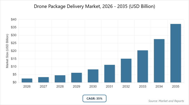 According to MarketnReports, the global Drone Package Delivery market size was estimated at USD 2.5 billion in 2025 and is expected to reach USD 50 billion by 2035, growing at a CAGR of 35% from 2026 to 2035. The rapid expansion of e-commerce and the demand for faster, cost-effective last-mile delivery solutions.