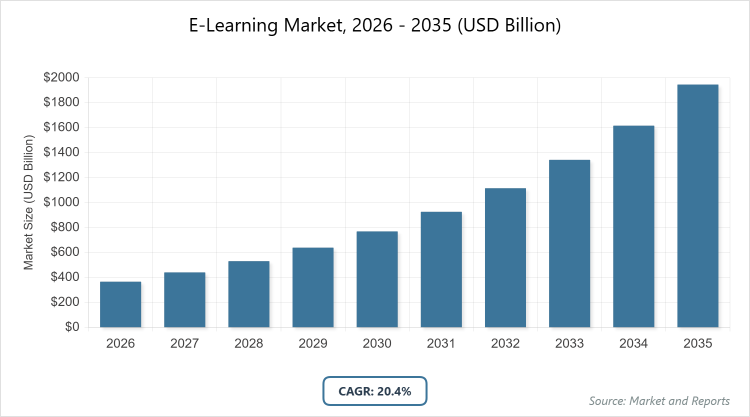 The compound annual growth rate (CAGR) for the e-learning market is expected to be 20.4% from 2026 to 2035.