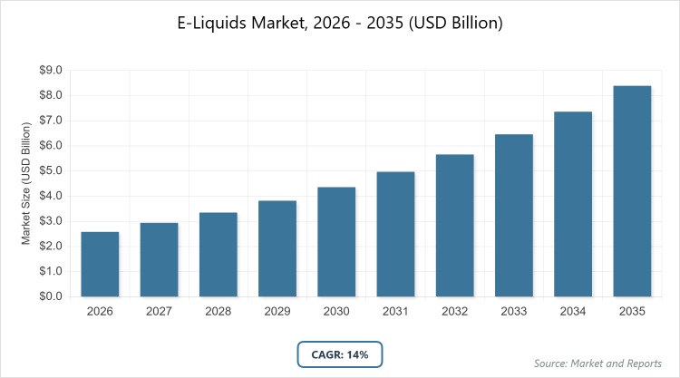 According to MarketnReports, the global E-Liquids market size was estimated at USD 2.58 billion in 2025 and is expected to reach USD 9.5 billion by 2035, growing at a CAGR of 14% from 2026 to 2035. E-Liquids Market is driven by increasing adoption of vaping as a safer alternative to traditional smoking.