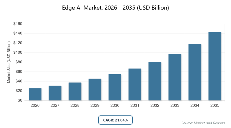 According to MarketnReports, the global Edge AI market size was estimated at USD 25.65 billion in 2025 and is expected to reach USD 143.06 billion by 2035, growing at a CAGR of 21.04% from 2026 to 2035. Edge AI Market is driven by increasing demand for real-time data processing, low-latency applications, and enhanced data privacy in IoT and 5G ecosystems.