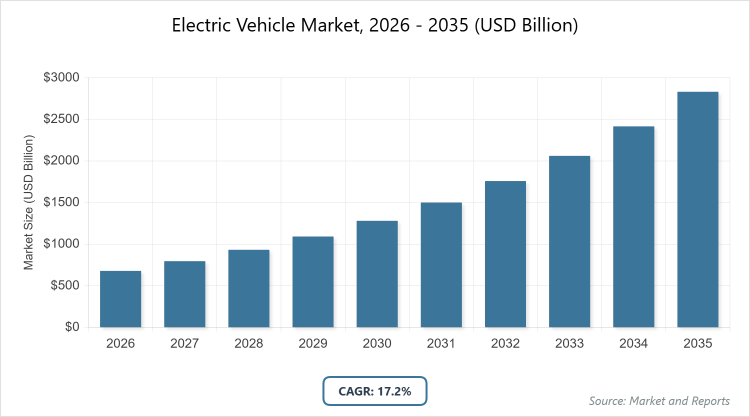 According to MarketnReports, the global Electric Vehicle Market size was estimated at USD 678.66 Billion in 2025 and is expected to reach USD 3338.87 Billion by 2035, growing at a CAGR of 17.2% from 2026 to 2035. Electric Vehicle Market is driven by government incentives, advancements in battery technology, and rising environmental awareness.