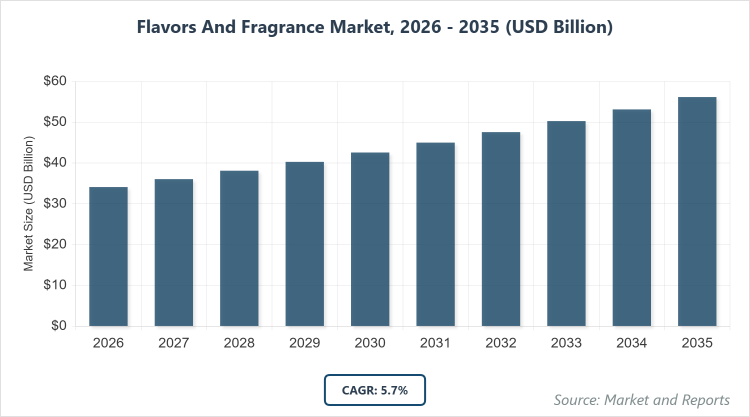 According to MarketnReports, the global Flavors and Fragrances market size was estimated at USD 34.1 billion in 2025 and is expected to reach USD 59.4 billion by 2035, growing at a CAGR of 5.7% from 2026 to 2035. The Rising demand for natural and organic products in the food, beverages, and personal care industries.