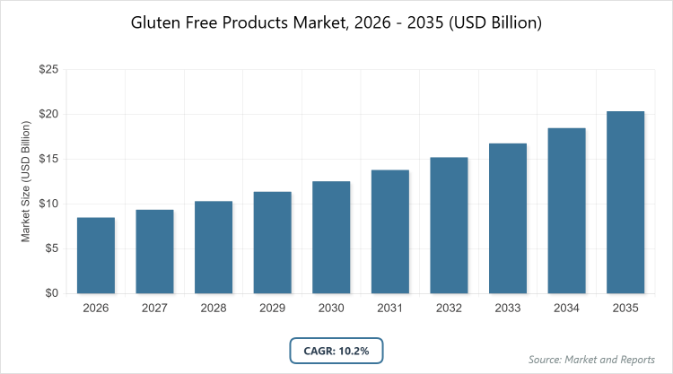 According to MarketnReports, the global Gluten Free Products Market size was estimated at USD 8.5 billion in 2025 and is expected to reach USD 21.6 billion by 2035, growing at a CAGR of 10.2% from 2026 to 2035. Gluten Free Products Market is driven by increasing prevalence of celiac disease and rising health consciousness among consumers.What are the Key Insights of Gluten Free Products Market?