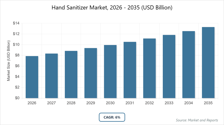According to MarketnReports, the global Hand Sanitizer market size was estimated at USD 7.87 billion in 2025 and is expected to reach USD 13.30 billion by 2035, growing at a CAGR of 6.0% from 2026 to 2035. Hand Sanitizer Market is driven by sustained hygiene awareness and innovation in eco-friendly formulations.