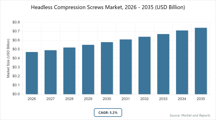 According to MarketnReports, the global Headless Compression Screws market size was estimated at USD 0.47 billion in 2025 and is expected to reach USD 0.78 billion by 2035, growing at a CAGR of 5.2% from 2026 to 2035. Headless Compression Screws Market is driven by the increasing prevalence of orthopedic injuries and rising demand for minimally invasive surgeries.