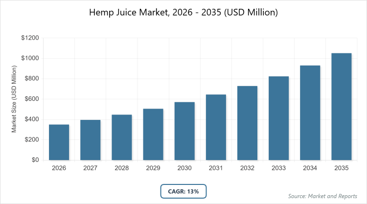According to MarketnReports, the global Hemp Juice market size was estimated at USD 350 million in 2025 and is expected to reach USD 1,200 million by 2035, growing at a CAGR of 13% from 2026 to 2035. Rising consumer interest in natural, nutrient-rich functional beverages.