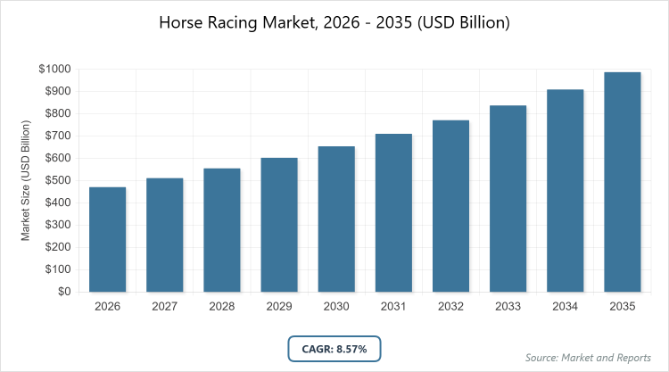 According to MarketnReports, the global Horse Racing market size was estimated at USD 471.17 billion in 2025 and is expected to reach USD 1072.56 billion by 2035, growing at a CAGR of 8.57% from 2026 to 2035. The surge in online betting platforms and the increasing global sports tourism.