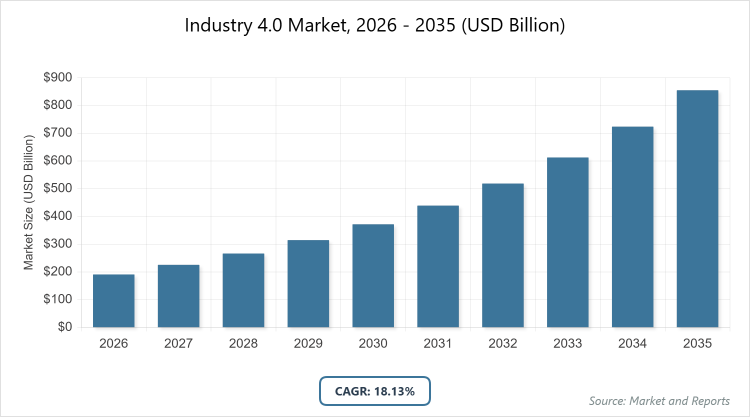 According to MarketnReports, the global Industry 4.0 market size was estimated at USD 190.87 billion in 2025 and is expected to reach USD 1009.08 billion by 2035, growing at a CAGR of 18.13% from 2026 to 2035. Industry 4.0 Market is driven by the integration of advanced technologies like AI and IoT to enhance manufacturing efficiency and productivity.