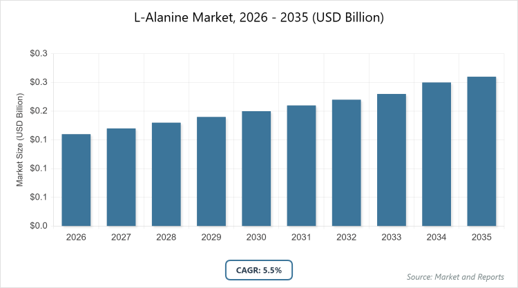 According to MarketnReports, the global L-Alanine market size was estimated at USD 0.16 billion in 2025 and is expected to reach USD 0.30 billion by 2035, growing at a CAGR of 5.5% from 2026 to 2035. The L-Alanine Market is driven by the rising demand for dietary supplements and functional foods among health-conscious consumers.