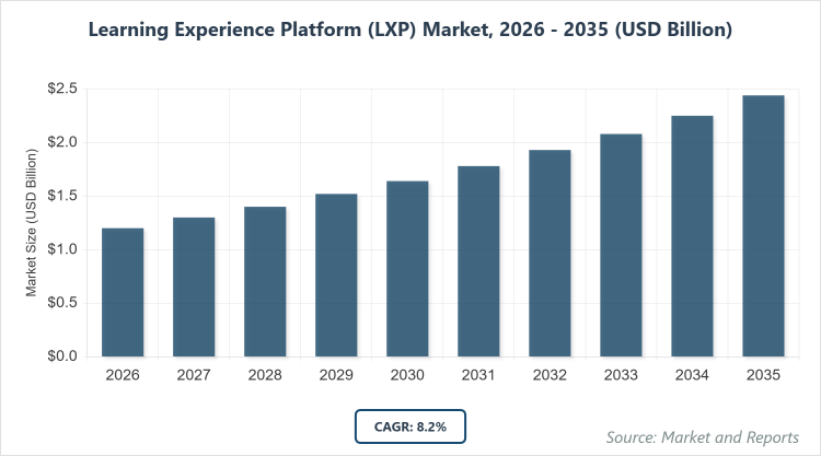 According to MarketnReports, the global Learning Experience Platform (LXP) market size was estimated at USD 1.2 billion in 2025 and is expected to reach USD 2.6 billion by 2035, growing at a CAGR of 8.2% from 2026 to 2035. Learning Experience Platform (LXP) Market is driven by the increasing demand for personalized and adaptive learning solutions amid the shift to remote and hybrid work models.