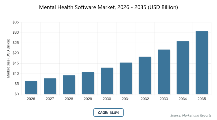 According to MarketnReports, the global Mental Health Software market size was estimated at USD 6.51 billion in 2025 and is expected to reach USD 35 billion by 2035, growing at a CAGR of 18.8% from 2026 to 2035. Mental Health Software Market is driven by increasing awareness of mental health issues and the adoption of digital solutions for behavioral health management.