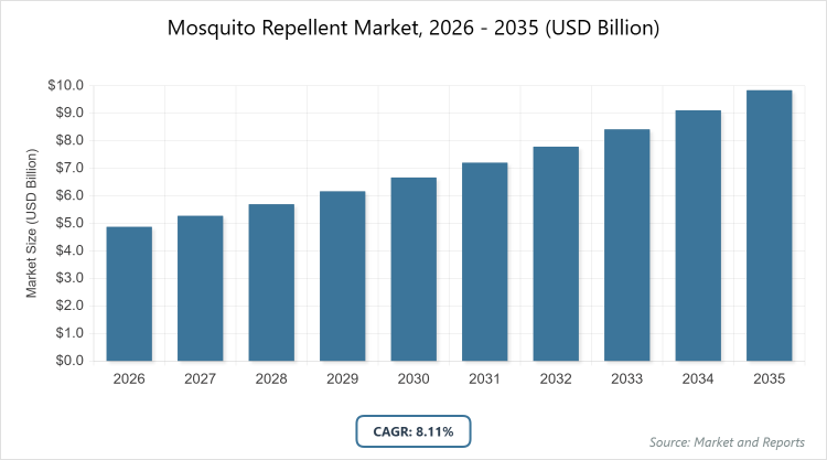 According to our latest research, the global mosquito repellent market is projected to grow from USD 4.88 billion in 2026 to USD 9.85 billion by 2035, growing at a CAGR is estimated at 8.11% during 2026-2035. The Mosquito Repellent Market is primarily driven by the rising incidence of vector-borne diseases and changing climatic patterns, which facilitate expanded mosquito breeding grounds and compel consumers toward safe, plant-based, and long-lasting personal protection solutions.