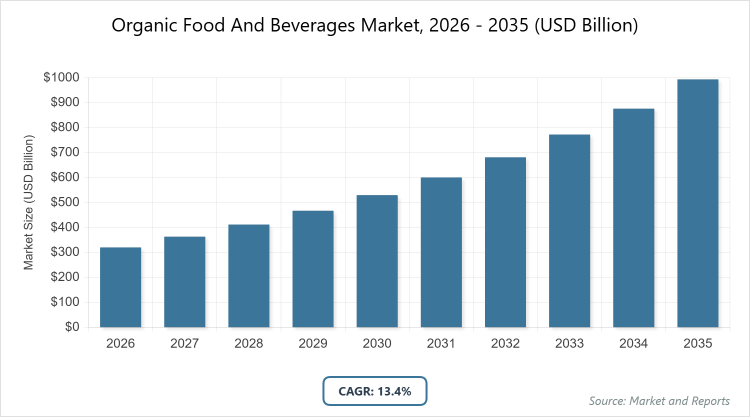 According to MarketnReports, the global Organic Food And Beverages market size was estimated at USD 320.4 billion in 2025 and is expected to reach USD 1130.4 billion by 2035, growing at a CAGR of 13.4% from 2026 to 2035. Rising health consciousness, environmental sustainability concerns, and preference for chemical-free products.