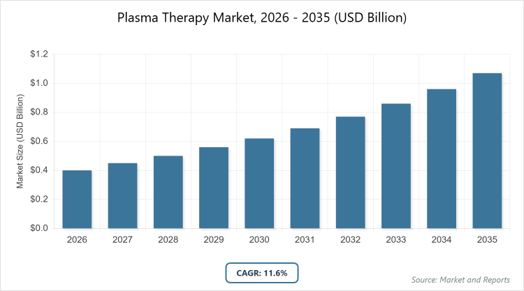 According to MarketnReports, the global Plasma Therapy market size was estimated at USD 0.4 billion in 2025 and is expected to reach USD 1.2 billion by 2035, growing at a CAGR of 11.6% from 2026 to 2035. The plasma therapy market is driven by rising demand for regenerative medicine and minimally invasive treatments in orthopedics and aesthetics.