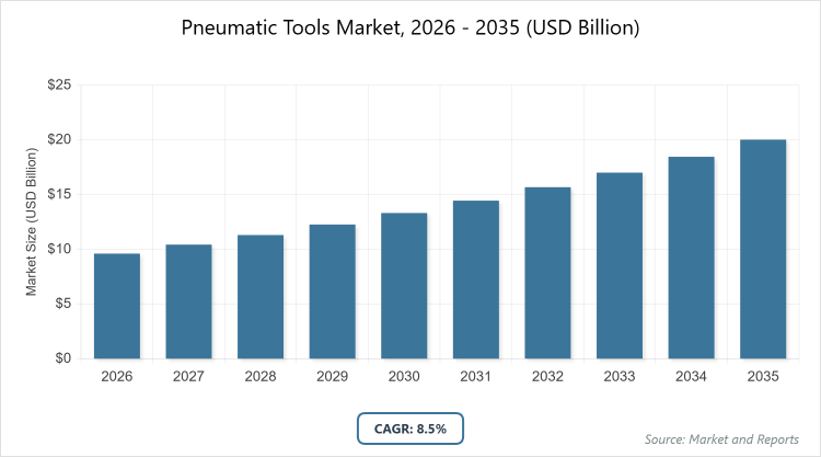According to MarketnReports, the global Pneumatic Tools market size was estimated at USD 9.61 billion in 2025 and is expected to reach USD 21.63 billion by 2035, growing at a CAGR of 8.5% from 2026 to 2035. Pneumatic Tools Market is driven by rising industrial automation and expansion in automotive and construction sectors.