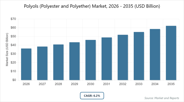 According to MarketnReports, the global Polyols (Polyester and Polyether) market size was estimated at USD 36.2 billion in 2025 and is expected to reach USD 69.3 billion by 2035, growing at a CAGR of 6.2% from 2026 to 2035. Polyols (Polyester and Polyether) Market is driven by increasing demand for polyurethane products in construction and automotive sectors.