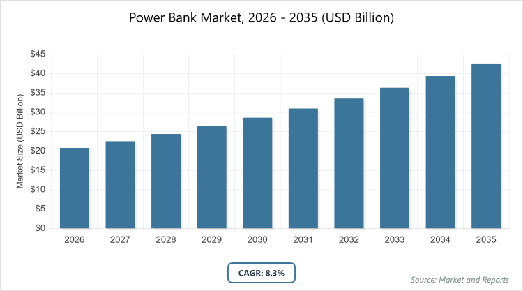 According to MarketnReports, the global Power Bank Market size was estimated at USD 20.8 billion in 2025 and is expected to reach USD 46.3 billion by 2035, growing at a CAGR of 8.3% from 2026 to 2035. Power Bank Market is driven by increasing adoption of smartphones and electronic devices.