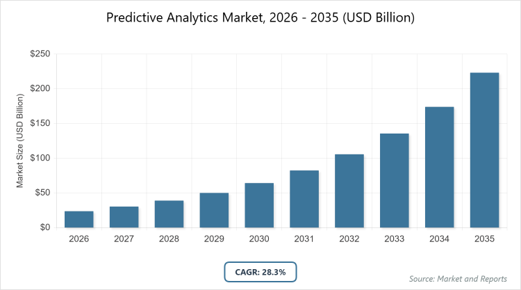According to MarketnReports, the global Predictive Analytics market size was estimated at USD 23.70 billion in 2025 and is expected to reach USD 286.30 billion by 2035, growing at a CAGR of 28.3% from 2026 to 2035. Predictive Analytics Market is driven by the exponential growth of data and advancements in AI and machine learning.
