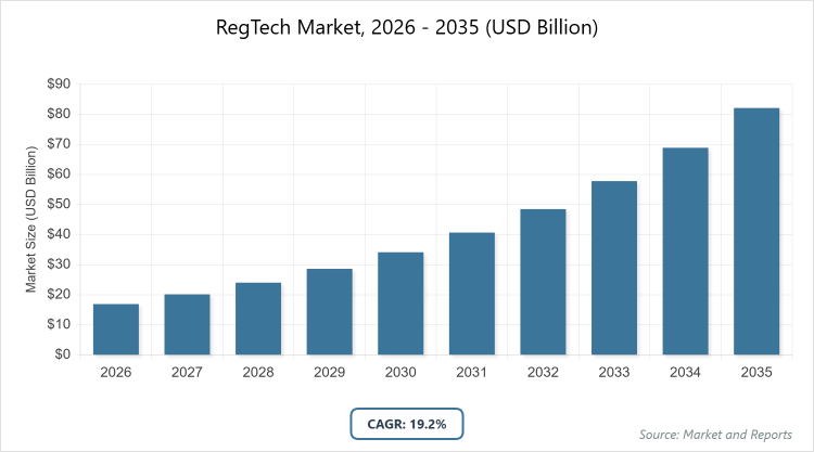- The global RegTech Market was valued at USD 16.9 billion in 2025 and is projected to reach USD 97.6 billion by 2035.