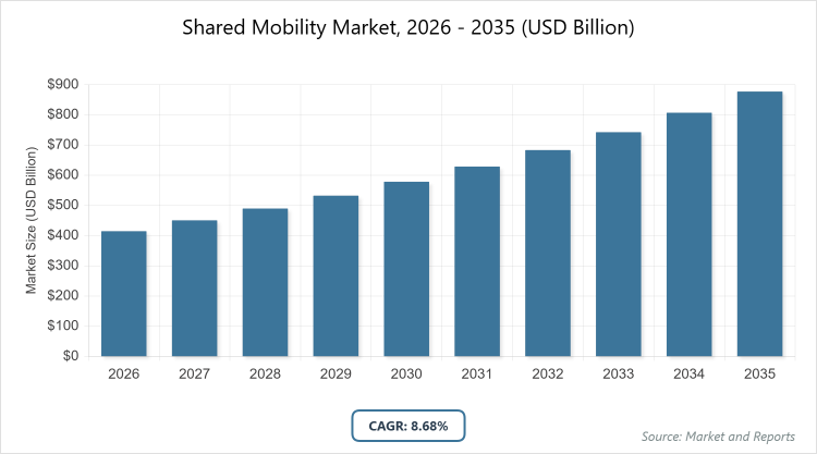 According to MarketnReports, the global Shared Mobility market size was estimated at USD 414.71 billion in 2025 and is expected to reach USD 953.73 billion by 2035, growing at a CAGR of 8.68% from 2026 to 2035. Increasing urbanization and demand for sustainable transportation options.