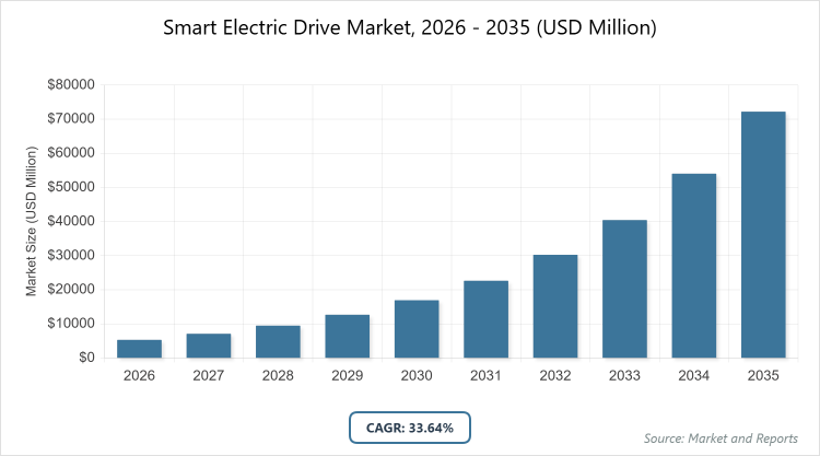 The global Smart Electric Drive Market size was estimated at USD 5310 Million in 2025 and is expected to reach USD 73250 Million by 2035, growing at a CAGR of 33.64% from 2026 to 2035. The Smart Electric Drive Market is primarily driven by the global shift toward zero-emission transportation and the rising demand for energy-efficient, high-performance propulsion systems to comply with stringent environmental regulations.