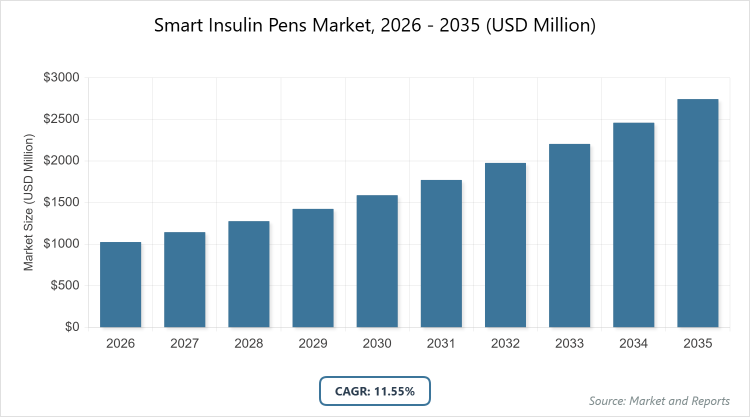 The smart insulin pens market is projected to grow from approximately USD 1026 million in 2026 to USD 2743 million by 2035.