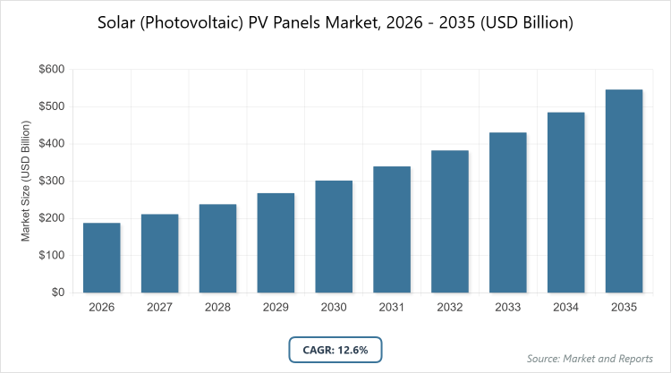 According to MarketnReports, the global solar (photovoltaic) PV panels market size was estimated at USD 187.7 billion in 2025 and is expected to reach USD 616.59 billion by 2035, growing at a CAGR of 12.6% from 2026 to 2035. Government incentives and declining technology costs.
