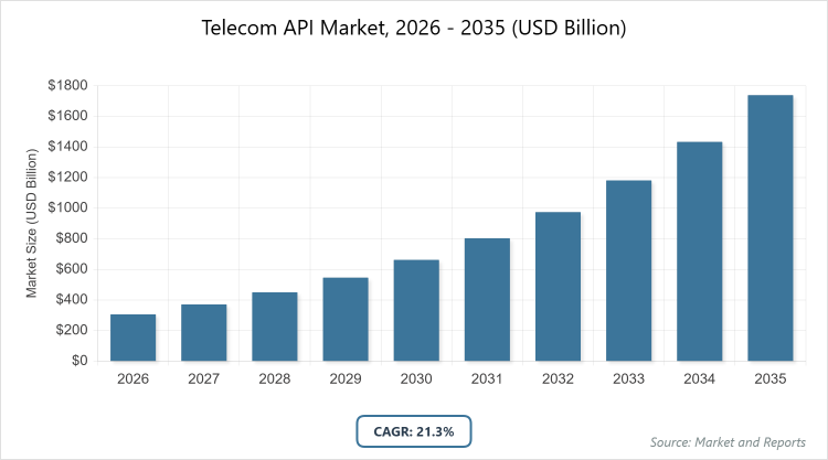 The telecom API market is projected to grow from approximately USD 305.85 billion in 2026 to USD 1,741.39 billion by 2035, reflecting robust expansion.