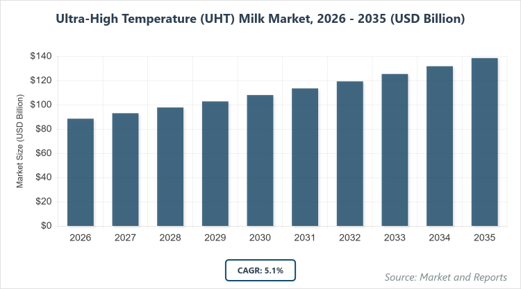 According to MarketnReports, the global Ultra-High Temperature (UHT) Milk market size was estimated at USD 88.6 billion in 2025 and is expected to reach USD 145.4 billion by 2035, growing at a CAGR of 5.1% from 2026 to 2035. Ultra-High Temperature (UHT) Milk Market is driven by increasing demand for shelf-stable dairy products due to urbanization and convenience.